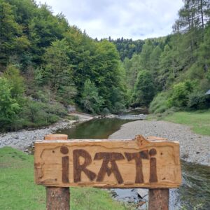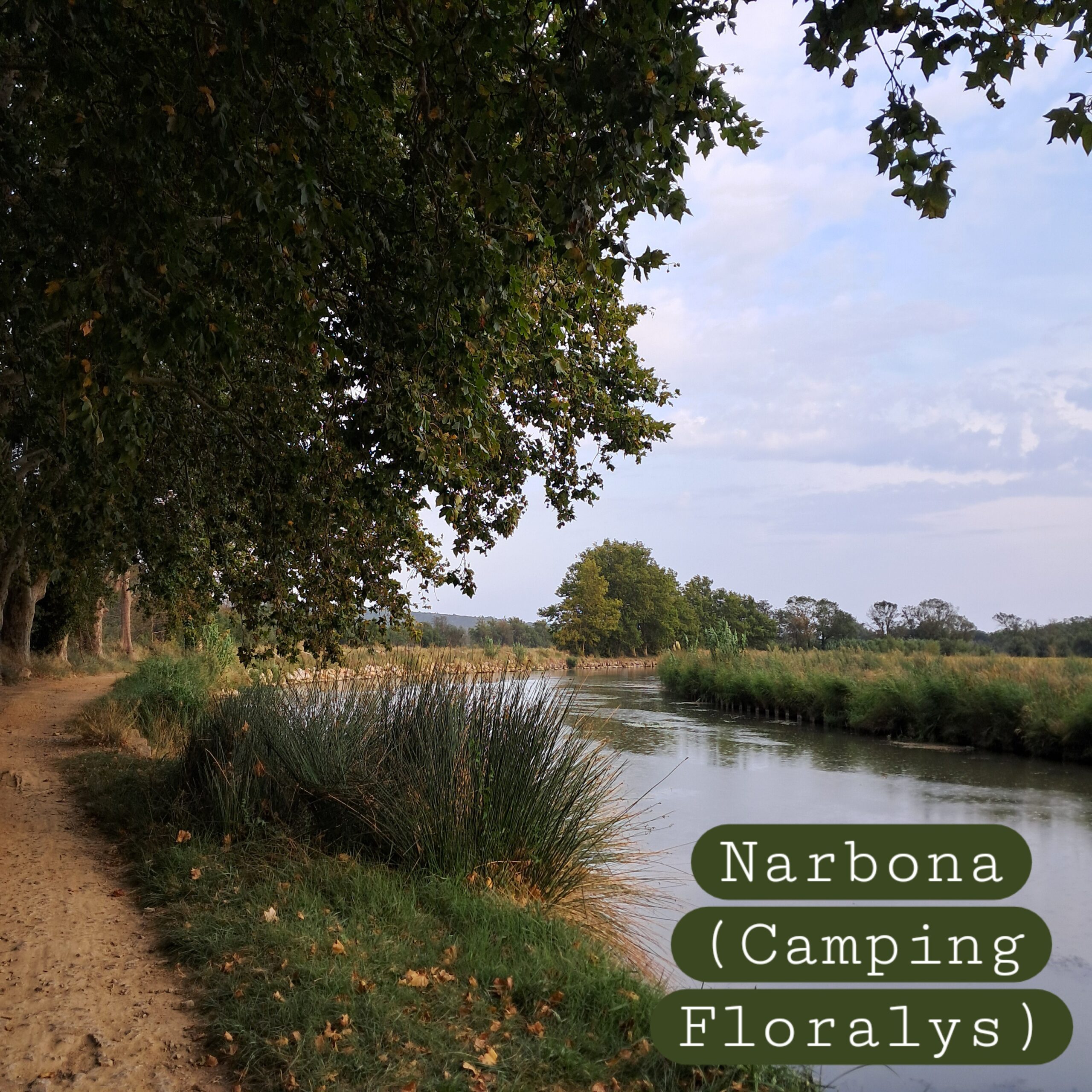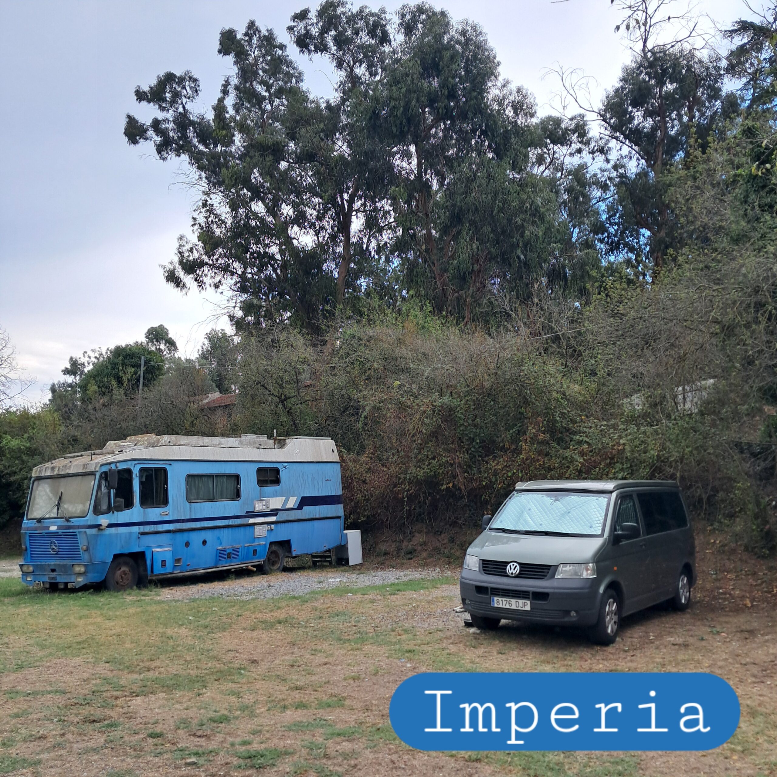 – y luego, siguiendo el río, llegar al camping. Una pareja sueca, que ella es clara, directa, y guía bien. Y hay una carabana verde en el logo.Y hay una carabana de verdad a lo alto de una caseta, y es verde. Es como que las cosas si son, son.